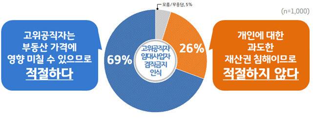 경기도가 지난 16일 도민 1천명을 상대로 조사한 결과 응답자의 69%는 '고위공직자는 부동산가격에 영향을 미칠 수 있으므로 임대사업을 못 하게 하는 것은 적절한 조처'라고 답했다.