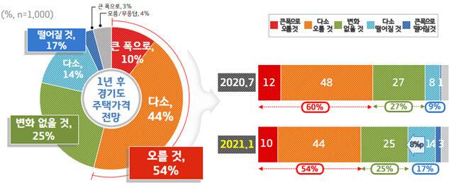 1년 뒤 경기도 지역 주택가격 전망을 묻는 항목에는 응답자의 54%가 ‘오를 것', 25%는 ‘변화가 없을 것', 17%는 ‘떨어질 것'이라고 답했다. 지난해 7월 조사 때는 ‘오를 것'이라는 응답이 60%, ‘변화가 없을 것’ 27%, ‘떨어질 것’ 9%로 응답했다.