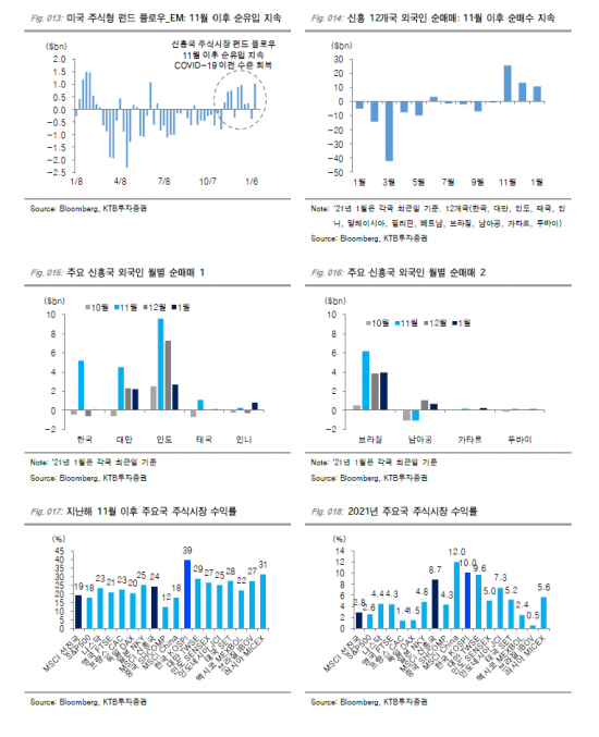 신흥국 국가별로는 외국인 순매수의 상대적 격차가 확인되는데 인도(11월~1월 195억 달러), 대만(90억 달러), 브라질(140억 달러)의 경우 외국인 순매수가 두드러지고 있는 반면 한국은 지난해 11월을 제외하고는 외국인 동향이 관망세(동기간 47억 달러)에 치우치고 있다.