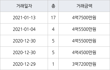 [이 기사는 조선비즈와 아티웰스가 공동으로 개발해 서비스하는 로봇 기사입니다.]국토교통부 실거래가 공개시스템에 따르면 지난 2021년 1월 4일 경기도 수원시 영통구 영통동 영통벽적골두산한신 4층 전용면적 59㎡형이 4억5500만원에 거래됐다.