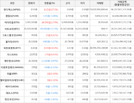 또한, 엔진코인(-5.45%, 451원), 체인링크(-4.04%, 26,360원), 폴카닷(-3.27%, 20,100원), 퀀텀(-3.06%, 4,280원), 에이다(-1.05%, 378원), 테조스(-0.14%, 3,500원)가 하락세를 나타냈다.