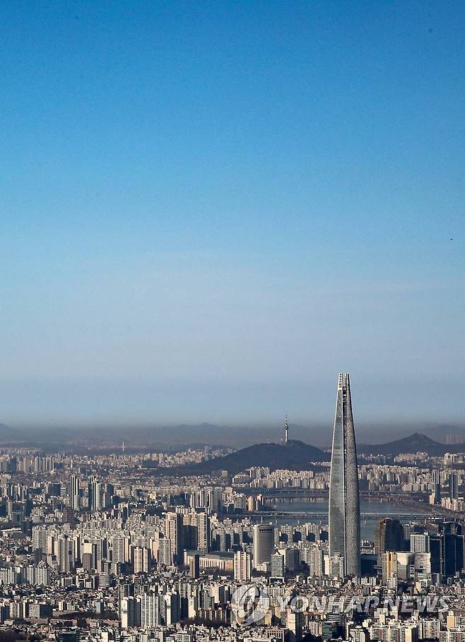 (경기 광주=연합뉴스) 황광모 기자 = 서울을 비롯한 수도권에 봄 같은 날씨를 보인 24일 오전 경기도 광주 남한산성에서 바라본 서울 일대 파란 하늘 아래 검은 스모그 띠가 보이고 있다. 2021.1.24