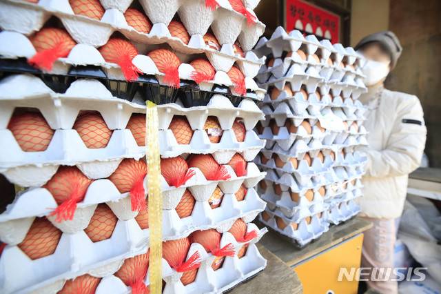 [서울=뉴시스]박민석 기자 = 고병원성 조류인플루엔자(AI)를 이유로 살처분한 산란계 수가 1천만마리를 넘어선 24일 서울 동대문구 청량리 농수산물시장의 한 달걀 가게에 달걀이 진열돼 있다. 지난 22일 특란의 산지 가격은 10개당 1천697원으로 평년(2016∼2020년) 1월에 비해 43.6%, 지난해 1월에 비해 45.8% 상승했다. 2021.01.24. mspark@newsis.com