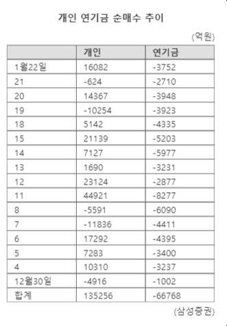 반면 개인은 지난해 12월 24일부터 현재까지 13조9739억원을 순매수하면서 '삼천피'의 주역이 되고 있다. 개인들은 주식관련 온라인 게시판이나 토론방에 역대급 순매도 행진을 보이고 있는 연기금이 지수 상승을 가로막고 있다며 '개미 죽이기'에 나섰다고 성토하고 있다.