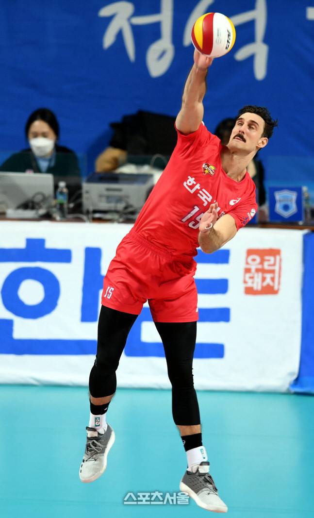 한국전력 러셀이 24일 서울장충체육관에서 열린 2020-2021 V리그 우리카드와 한국전력의 경기에서 서브를 넣고 있다.