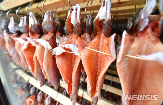 [화천=뉴시스] 한윤식 기자 = 강원 화천 산천어 제품 출시를 하루 앞둔 24일 오후 상서면 신풍리에 마련된 비닐하우스에서 건조작업이 한창이다. (사진=화천군청 제공) 2021.01.24. ysh@newsis.com