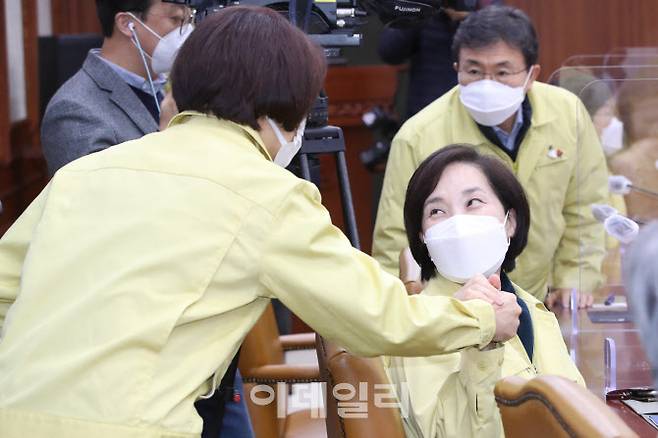 [이데일리 이영훈 기자] 유은혜 사회 부총리 겸 교육부 장관(오른쪽)과 한정애 환경부 장관이 24일 오후 서울 종로구 정부서울청사에서 열린 코로나19 대응 중앙재난안전대책본부 회의에서 대화를 나누고 있다.