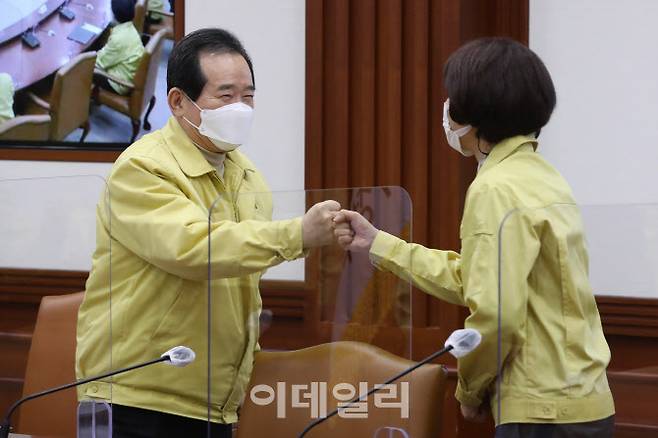 [이데일리 이영훈 기자] 정세균 국무총리(왼쪽)와 한정애 환경부 장관이 24일 오후 서울 종로구 정부서울청사에서 열린 코로나19 대응 중앙재난안전대책본부 회의에서 인사를 나누고 있다.