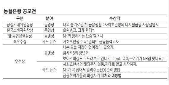 한국소비자원장상과 농협은행장상은 고령층을 위한 디지털 금융을 상세하게 소개한 작품이 선정했다. 특히 금융앱을 통해 편리한 송금을 하고 마트 같은 곳에서 현금 대신 포인트 활용 방법 등을 쉽게 따라할 수 있도록 한 작품이다. 농협은행 관계자는 "소비자 단체, 학계 등과 연계해 전국의 학생 및 금융 취약계층을 대상으로 금융교육 자료로 활용할 계획"이라고 전했다.