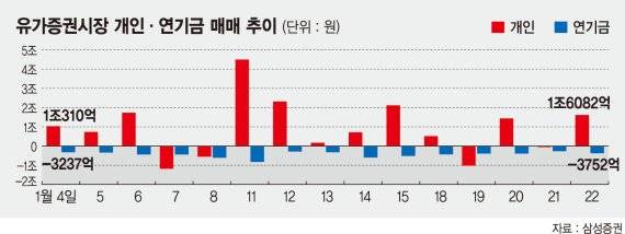 반면 개인은 지난해 12월 24일부터 현재까지 13조9739억원을 순매수하면서 '삼천피'의 주역이 되고 있다. 개인들은 주식관련 온라인 게시판이나 토론방에 역대급 순매도 행진을 보이고 있는 연기금이 지수 상승을 가로막고 있다며 '개미 죽이기'에 나섰다고 성토하고 있다.
