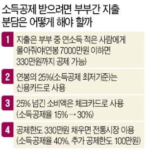 맞벌이 부부가 신용카드 소득공제를 받으려면 급여가 적은 쪽의 카드로 지출하는 것이 유리하다. 카드 소득공제는 소득이 적을수록 공제한도가 큰 구조로 짜여 있어서다. 카드 소득공제는 일단 총 급여액의 25%를 초과해야 혜택을 받을 수 있기 때문에 급여가 적은 쪽이 유리한 측면도 있다.