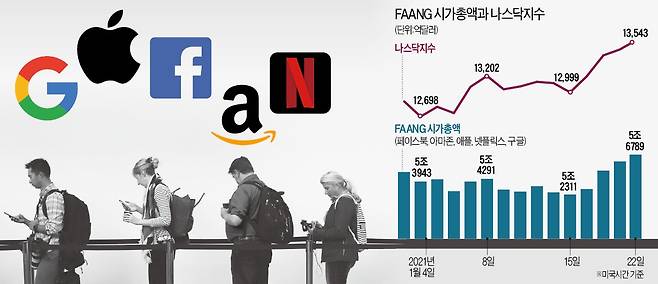 작년 4분기 실적 발표 일정은 26일 마이크로소프트, 27일 테슬라(TSLA) 페이스북(FB) 애플(AAPL), 2월 2일 구글(GOOGL) 아마존(AMZN) 등으로 잡혀 있다. 관심은 넷플릭스처럼 실적이 상승 전환의 계기가 될 것이냐에 쏠린다. 넷플릭스는 지난 19일 전 분기 실적 발표 후 12.64% 급등했다. 신규 가입자 수가 회사 추정치(600만 명)를 한참 웃돈 851만 명이라는 게 호재로 작용했다.