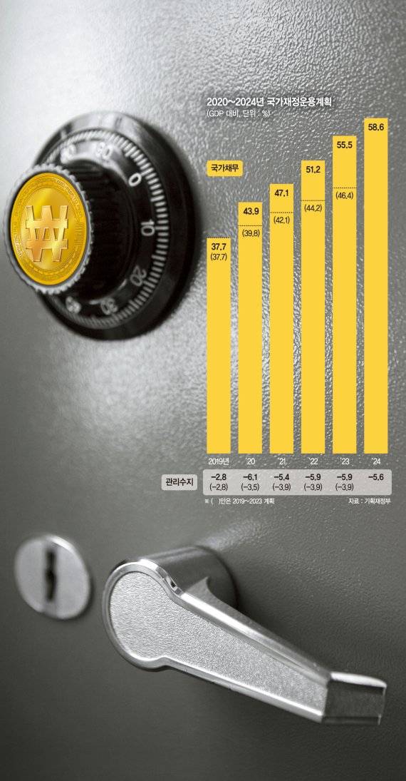 국가채무가 늘어나면서 관리재정수지에는 빨간불이 켜졌다. '2020~2024년 국가재정운용계획'에 따르면 관리재정수지는 지난해 -6.1%를 기록한 뒤 5% 중후반대를 기록하다 2024년에 -5.6%를 기록할 것으로 예상했다. '2019~2023년 국가재정운용계획'에서 겹치는 기간(2021~2023년)에 도출된 -3.9%보다 2% 정도 떨어진 수치다.