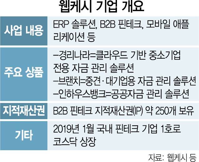 웹케시는 KDB산업은행·하나은행 등 각종 시중은행 차세대 시스템 구축 사업을 도맡아온 핀테크 솔루션 기업이다. B2B 핀테크와 시스템통합(SI), 모바일 애플리케이션 등의 사업을 운영하고 있고 지난 2019년 1월 국내 핀테크 기업 1호로 상장에 성공했다. 클라우드 기반 중소기업 전용 자금 관리 솔루션 ‘경리나라’를 비롯해 공공자금 관리 솔루션 ‘인하우스뱅크’, 중견·대기업용 자금 관리 솔루션 ‘브랜치’ 등 각종 전사적자원관리(ERP) 솔루션을 보유하고 있는 기업이다. 비대면 경제 수혜주로 지목되며 지난해 주가가 3월 대비 8개월 만에 160% 상승하기도 했다.