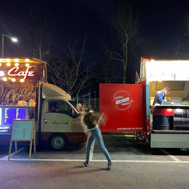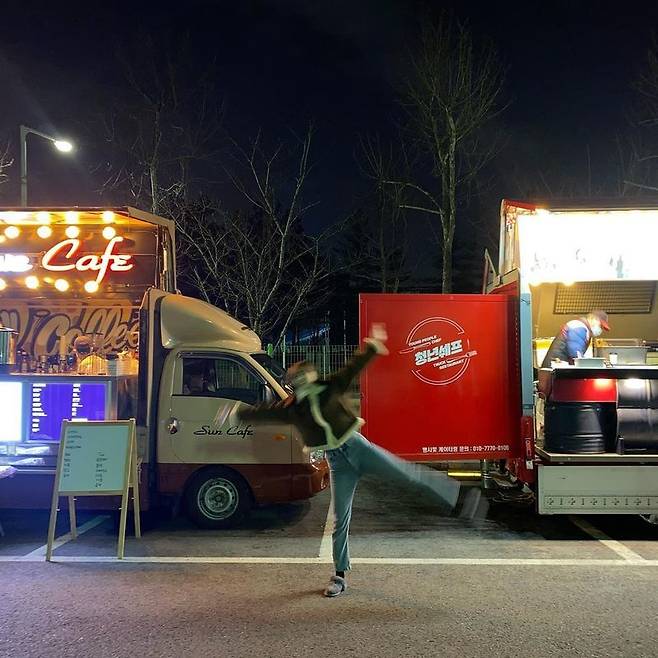 사진 속 혜리는 간식차 앞에서 한껏 신난 포즈를 취하고 있다.