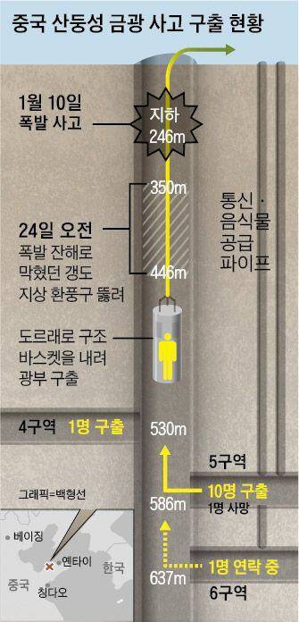 지난 10일 중국 산둥(山東)성 옌타이(煙臺)시에서 일어난 우차이룽(五彩龍) 금광 폭발 사고로 매몰됐던 광부 22명 가운데 24일 오후 8시까지 11명이 구출됐다. 지하에서 폭발 사고로 광부들이 지하 갱도에 매몰된 지 14일 만이다. 갱도와 지상을 연결하던 환풍구 통로가 뚫리면서 일어난 기적이었다.