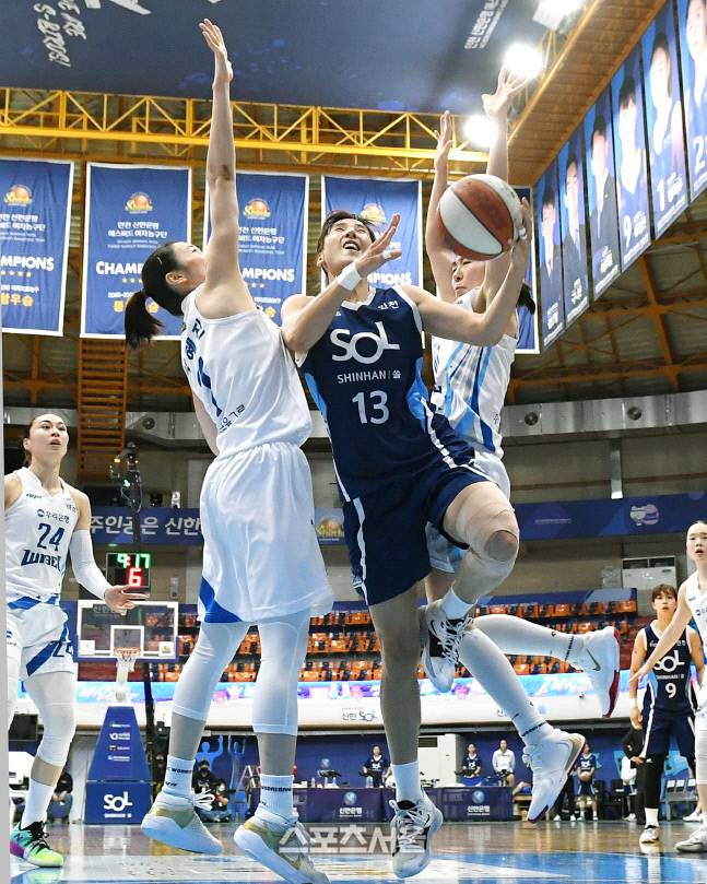 신한은행 김단비(가운데)가 24일 인천 도원체육관에서 열린 2020-2021 여자프로농구 신한은행과 우리은행의 경기에서 우리은행 김혜진-홍보람 사이로 레이업슛을 하고 있다. 2021. 1. 24.
