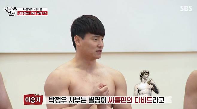 그 중에서도 박정우는 ‘씨름판의 다비드’라 불리는 최고의 스타. 이에 박정우는 “씨름 프로그램 할 때 팬 분들이 지어준 별명인데 쑥스럽다”고 수줍게 말했으나 노범수와 허선행은 “엄청 좋아했다” “옷 벗는 걸 좋아한다”며 짓궂게 덧붙이는 것으로 웃음을 자아냈다.