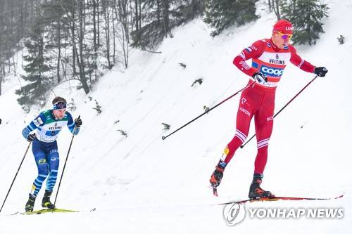 epa08961755 Joni Maeki of Finland (L) and Alexander Bolshunov of Russia (R) in action during the Men's Relay 4x7.5 km race at the FIS Cross Country World Cup in Lahti, Finland, 24 January 2021. EPA/KIMMO BRANDT