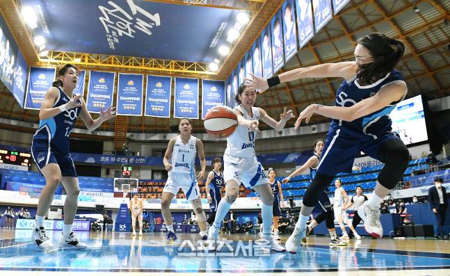 신한은행 한채진(오른쪽)이 24일 인천 도원체육관에서 열린 2020-2021 여자프로농구 신한은행과 우리은행의 경기에서 베이스라인 밖으로 나가려는 공을 잡아 팀 동료 김단비에게 패스하고 있다. 2021. 1. 24.