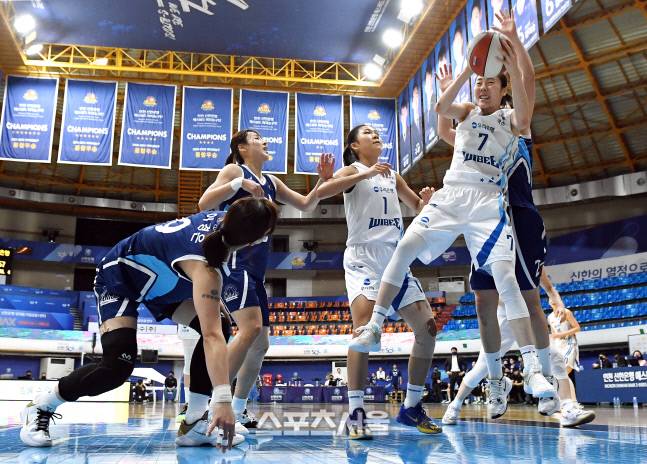 우리은행 박혜진(오른쪽)이 24일 인천 도원체육관에서 열린 2020-2021 여자프로농구 신한은행과 우리은행의 경기에서 리바운드를 잡아내고 있다. 2021. 1. 24.