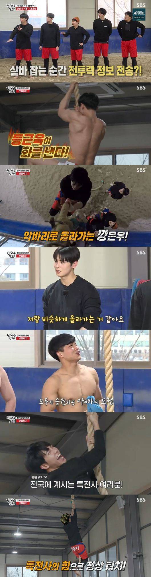 먼저 노범수 선수가 밧줄훈련으로 시범을 보였고, 차은우가 악바리 근성으로 또 한 번 놀루운 상체근력을 보였고, 모두 "근육천재"라며 놀라워했다. 이어 김동현은 오직 상체근육의 힘만으로 정상까지 올라 놀라움을 안겼다.