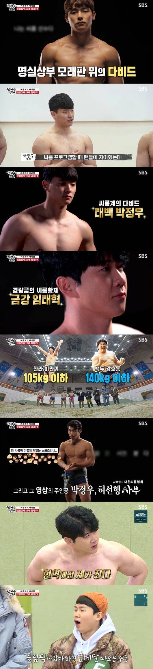 본격적으로 선수들을 소개, 2000년대 최연소 태백장사 허선행이 등장했고, 뒤이어 씨름계 다비드와 아이돌로 불리는 노범수, 박정우, 이만기 장사가 인정한 완성형 선수 임태혁이 등장했다. 멤버들은 씨름선수들의 체격을 보며 "체격이 대단하다, 조각사같다"며 감탄했다.