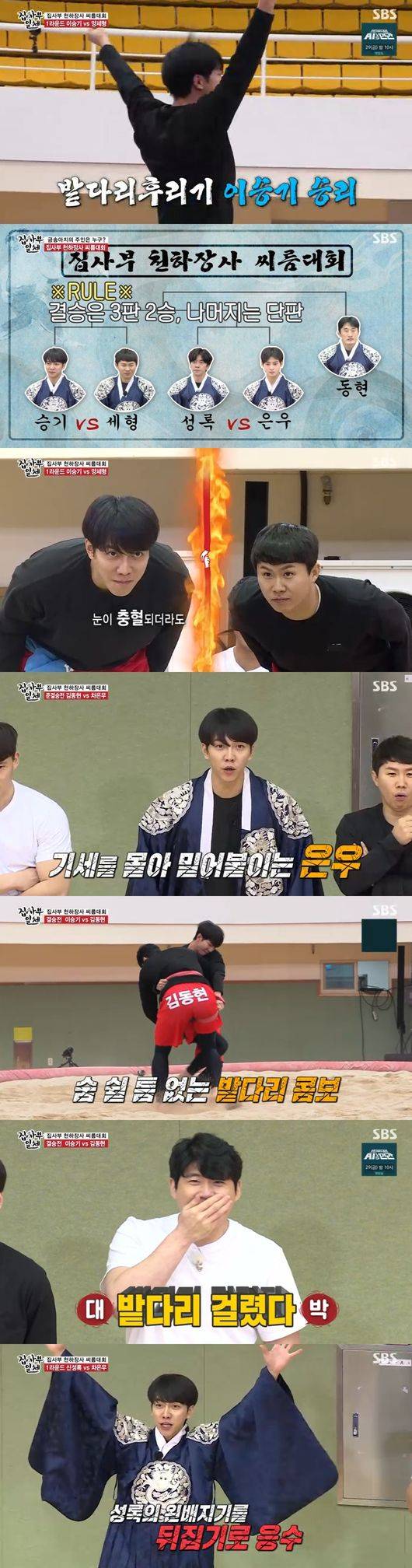 본격적으로 씨름대진표가 나왔고, 선수들 뿐만 아니라 사부들도 자존심이 걸렸다. 이승기와 양세형 대결이 먼저 펼쳐졌고, 모두 양세형이 이길 것이라 내다봤다. 이 가운데, 두 사람은 사뭇 진지한 모습으로 대결을 시작, 이승기가 밭다리 기술을 성공시키며 양세형을 넘겼다.