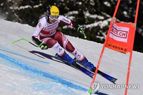 epa08961875 Austria's Tamara Tippler in action during the Women's Super G race at the FIS Alpine Ski World Cup in Crans-Montana, Switzerland, 24 January 2021. EPA/JEAN-CHRISTOPHE BOTT
