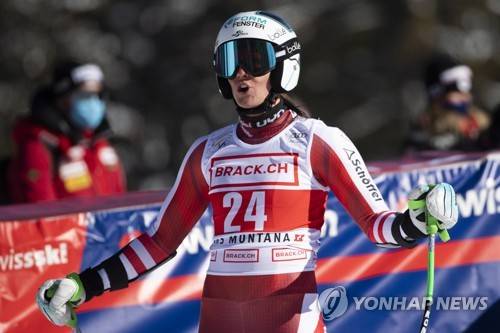 epa08961883 Austria's Ricarda Haaser reacts in the finish area during the Women's Super G race at the FIS Alpine Skiing World Cup in Crans-Montana, Switzerland, 24 January 2021. EPA/ALESSANDRO DELLA VALLE