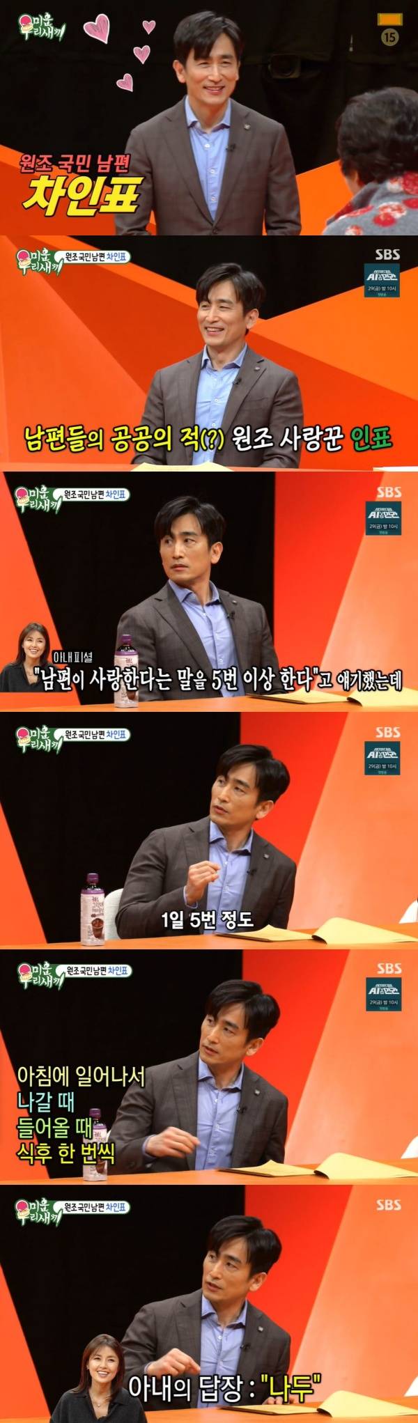 서장훈은 "저번에 신애라 씨가 출연하셨을 때 차인표 씨가 하루에 사랑한다는 말을 5번 이상 한다'고 말했다"고 운을 뗐다. 차인표는 "1일 5번 정도 한다. 아침에 일어났을 때, 나갈 때, 들어올 때, 식후 한 번씩"이라며 "밖에 일이 있을 때는 전화로 한다"고 밝혔다. 이어 "제가 안하면 누가 하겠습니까"라고 덧붙였다.