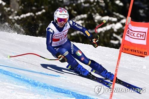epa08961948 Italy's Marta Bassino in action during the Women's Super G race at the FIS Alpine Ski World Cup in Crans-Montana, Switzerland, 24 January 2021. EPA/JEAN-CHRISTOPHE BOTT