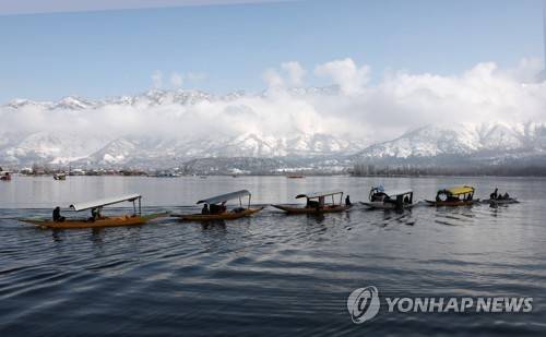 epaselect epa08961900 Boats cross the waters of Dal Lake in backdrop of cloudy and snow-covered mountains on a sunny day after fresh snowfall in Srinagar, the summer capital of Indian Kashmir, 24 January 2021. EPA/FAROOQ KHAN