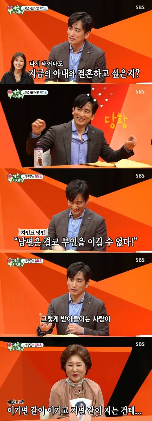 서장훈은 "남편은 결코 부인을 이길 수 없다?란 말을 했는데 진짜냐"라고 질문했다. 이에 차인표는 "부인은 적이 아니잖아요. 내 편이지. 같은 편이라 이기고 지고가 없지 않냐.그런 뜻으로 이야기했는데.. 그런 뜻으로 이해한 사람이 저밖에 없는 거 같다. 이런 뜻에서 저는 이긴 적이 없다"고 대답했다.
