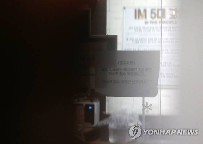 (대전=연합뉴스) 김준범 기자 = 24일 오후 신종 코로나바이러스 감염증(코로나19) 확진자가 무더기로 나온 대전시 중구 대흥동 IEM국제학교에 안내문이 붙어 있다. 대전시에 따르면 이날 IM선교회에서 운영하는 IEM국제학교 학생인 전남 순천 234번과 경북 포항 389번이 확진된 데 이어 대전에서 학생과 교직원 125명(대전 961∼1천85번)이 더 확진 판정을 받았다. 2021.1.24