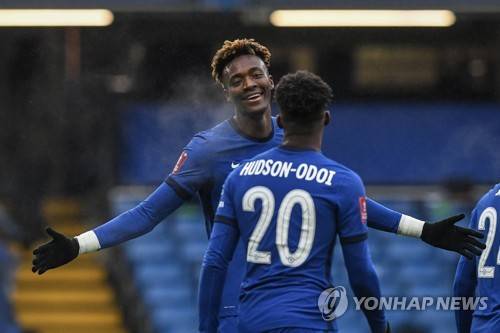 epa08962110 Tammy Abraham (top) of Chelsea celebrates with teammate Callum Hudson-Odoi after scoring during the English FA Cup fourth round match between Chelsea and Luton Town in London, Britain, 24 January 2021. EPA/NEIL HALL EDITORIAL USE ONLY. No use with unauthorized audio, video, data, fixture lists, club/league logos or 'live' services. Online in-match use limited to 120 images, no video emulation. No use in betting, games or single club/league/player publications.