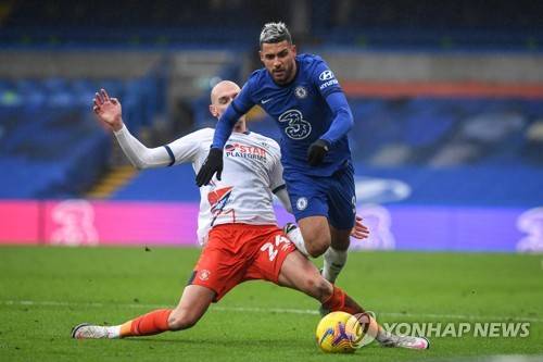 epa08962120 Emerson (R) of Chelsea in action against Kal Naismith (L) of Luton during the English FA Cup fourth round match between Chelsea and Luton Town in London, Britain, 24 January 2021. EPA/NEIL HALL EDITORIAL USE ONLY. No use with unauthorized audio, video, data, fixture lists, club/league logos or 'live' services. Online in-match use limited to 120 images, no video emulation. No use in betting, games or single club/league/player publications.