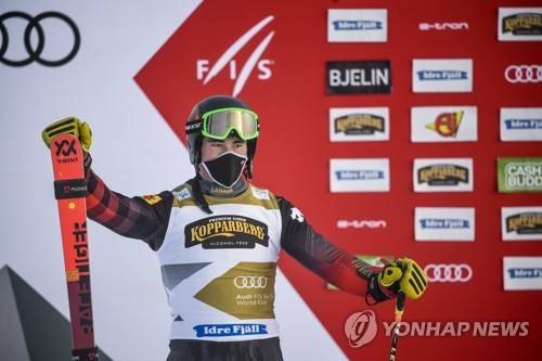 epa08962127 Reece Howden of Canada celebrates on the podium after winning the Men's big final at the FIS Freestyle Ski World Cup in Idre, Sweden, 24 January 2021. EPA/Pontus Lundahl SWEDEN OUT