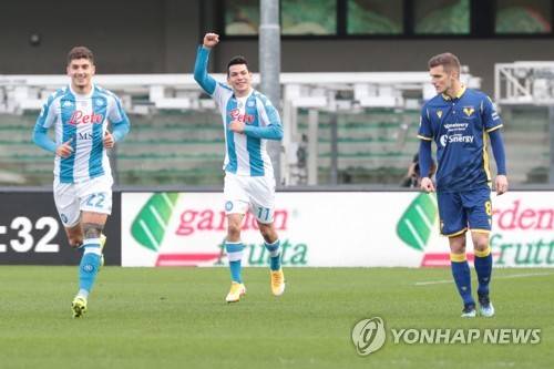 epa08962158 Napoli's Hirving Lozano (C) celebrates after scoring during the Italian Serie A soccer match Hellas Verona vs Napoli Calcio at Marcantonio Bentegodi stadium in Verona, Italy, 24 Juanary 2021. EPA/EMANUELE PENNACCHIO