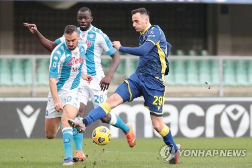 epa08962165 Napoli's Nikola Maksimovic (L) and Hellas Verona's Nikola Kalinic (R) in action during the Italian Serie A soccer match Hellas Verona vs Napoli Calcio at Marcantonio Bentegodi stadium in Verona, Italy, 24 Juanary 2021. EPA/EMANUELE PENNACCHIO