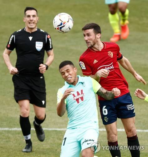 epa08962200 Osasuna's Oier (R) heads for the ball with Granada's Machis during the Spanish LaLiga soccer match Osasuna vs Granada at El Sadar stadium in Pamplona, Navarre, northern Spain, 24 January 2021. EPA/Jesus Diges