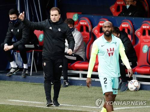 epa08962202 Osasuna's head coach Jagoga Arrasate (L) gestures from the sideline as Granada's Dimitri Foulquier (R) looks on during the Spanish LaLiga soccer match Osasuna vs Granada at El Sadar stadium in Pamplona, Navarre, northern Spain, 24 January 2021. EPA/Jesus Diges