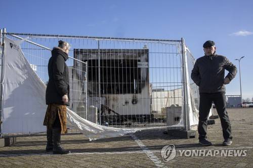 A person looks at a torched coronavirus testing facility in the Dutch fishing village of Urk, Sunday, Jan. 24, 2021, after it was set ablaze Saturday night by rioting youths protesting on the first night of a nation-wide curfew. (AP Photo/Peter Dejong)