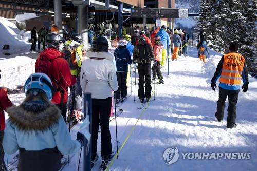 epa08962222 People line up before a skiing lift, in the Alpine resort of Anzere, Switzerland, 24 January 2021. EPA/LAURENT GILLIERON