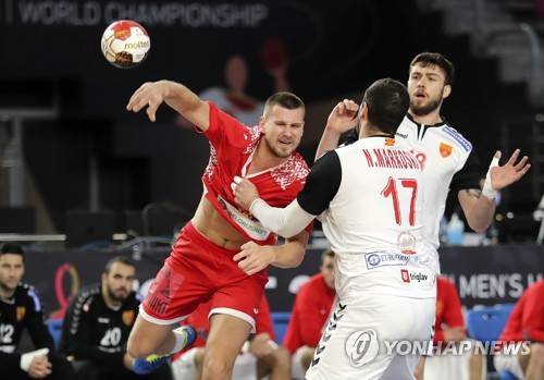 epa08962230 Andrei Yurynok (L) of Belarus in action against Nikola Markoski (R) of North Macedonia during the Main Round match between Belarus and North Macedonia at the 27th Men's Handball World Championship in Cairo, Egypt, 24 January 2021. EPA/Mohamed Abd El Ghany / POOL