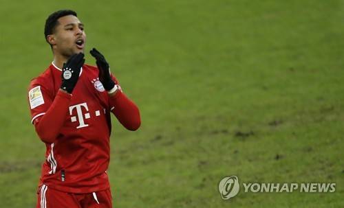 epa08962233 Bayern's Serge Gnabry reacts during the German Bundesliga soccer match between FC Schalke 04 and FC Bayern Munich in Gelsenkirchen, Germany, 24 January 2021. EPA/LEON KUEGELER / POOL DFL regulations prohibit any use of photographs as image sequences and/or quasi-video.