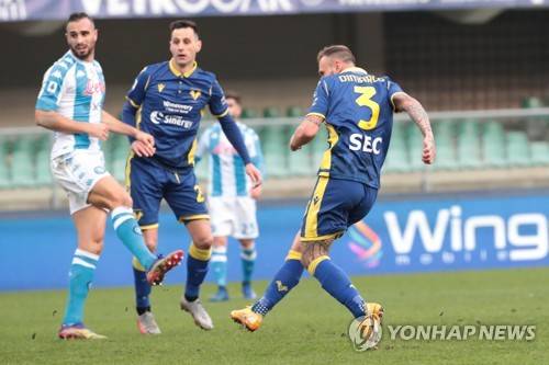 epa08962242 Hellas Verona's Federico Dimarco (R) scores the 1-1 goal during the Italian Serie A soccer match Hellas Verona vs Napoli Calcio at Marcantonio Bentegodi stadium in Verona, Italy, 24 Juanary 2021. EPA/EMANUELE PENNACCHIO