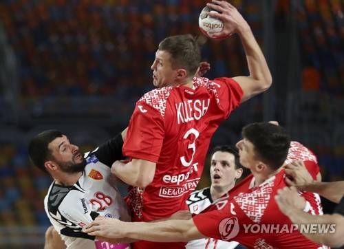 epa08962251 Uladzislau Kulesh (C) of Belarus in action against Martin Popovski (L) of North Macedonia during the Main Round match between Belarus and North Macedonia at the 27th Men's Handball World Championship in Cairo, Egypt, 24 January 2021. EPA/Mohamed Abd El Ghany / POOL