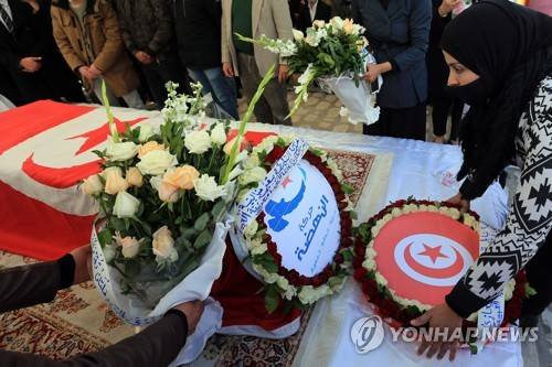 epa08962273 People pay their respects at the coffin of Former Vice-President of the Tunisian Constituent Assembly and member of the Islamic Movement Ennahdha, Meherzia Labidi in Grombalia south of Tunis, Tunisia, 24 January 2021. Labidi was one of the female figures of the Tunisian Islamic movement of Ennahdha. EPA/MOHAMED MESSARA