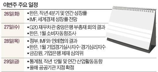 국제통화기금(IMF)은 26일 한국을 포함한 세계경제전망 수정치를 내놓는다. IMF는 지난해 10월 한국의 2021년 경제성장률 예상치를 3.0%에서 2.9%로 하향한 바 있다. 지난달 정부가 올해 경제성장률 전망치를 3.2%로 제시한 가운데 IMF가 올해 한국 경제를 어떻게 바라볼지 주목된다. IMF는 또 지난 13일부터 기재부, 금융위원회, 한국은행 등과 한국 경제 상황과 전망, 경제정책 전반에 대해 논의한 내용을 종합해 올해 연례협의 결과를 28일 발표한다.